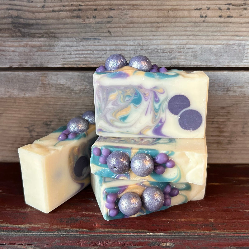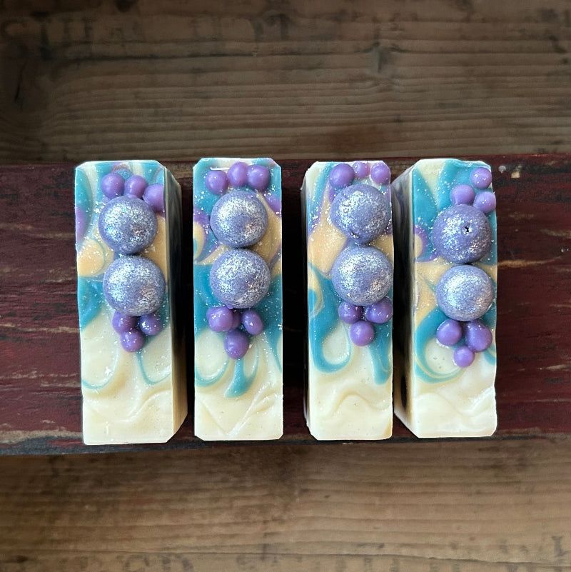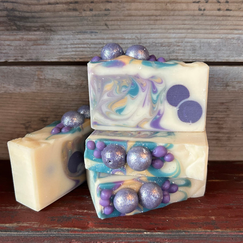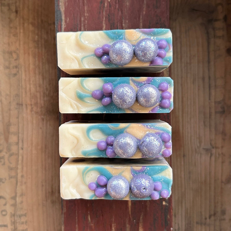 Ingredients: Olive oil, distilled water, organic coconut oil, organic palm oil, sodium hydroxide, phthalate-free fragrance oil, organic castor oil, shea butter, cocoa butter, sweet almond oil, sodium lactate, titanium dioxide, cane sugar, tussah silk, micas, & eco glitter. (berries on top are made with melt and pour glycerin soap base.